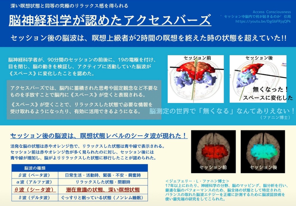 アクセスバーズは頭にある32ヶ所のポイントのことをいいます。そこに優しく触れることで自分が幸せになることから妨げている思考や考えや信念、感情などを解放してくれます。セッション中から脳波はシータ波になり瞑想しているような状態でリラックスできてストレスが解消されます。
